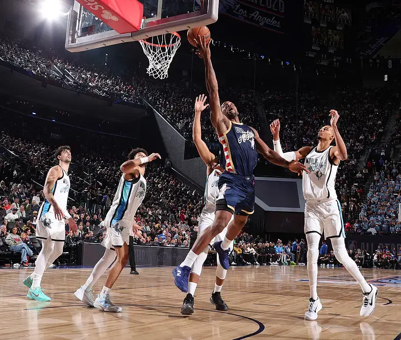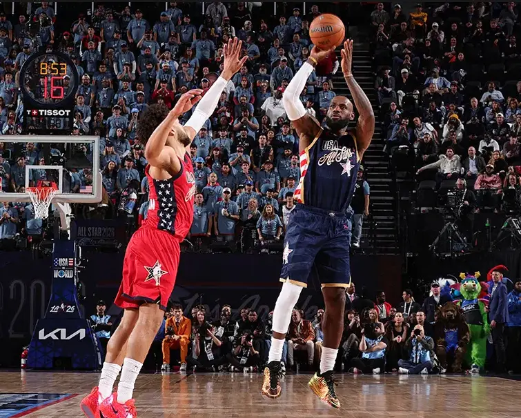 暂停后美国新星队打出一波10-2,唐斯扣篮得分后霍姆格伦内线也得分,文班亚马罚球得分后爱德华兹命中三分,最终两队32-32打平进入加时赛。加时赛爱德华兹中投命中,文班亚马命中三分后巴恩斯命中三分绝杀世界队。而当世界队输掉比赛的时候,文班亚马也是非常的生气愤怒,毕竟从比赛开始后文班亚马就有着强烈的赢球欲望,可惜最终世界队还是输掉比赛,文班亚马这里5中4得到了14分6篮板的数据。而美国星条队对阵美国新星队,美国星条队首发为:布伦森、布朗、詹姆斯、伦纳德和杜兰特。